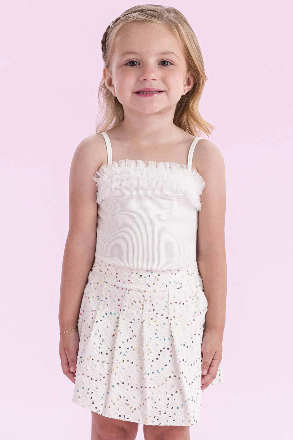O conjunto infantil Petit Cherie combina conforto e um toque de glamour na medida certa. A regata de alças finas possui babado delicado no decote e brilho sutil que realça o visual com elegância. A saia em modelagem evasê traz aplicação de pedrinhas coloridas formando desenhos delicados, garantindo um efeito encantador. Confeccionado em tecido leve, é ideal para dias ensolarados ou ocasiões especiais, proporcionando estilo e liberdade de movimentos para as pequenas.