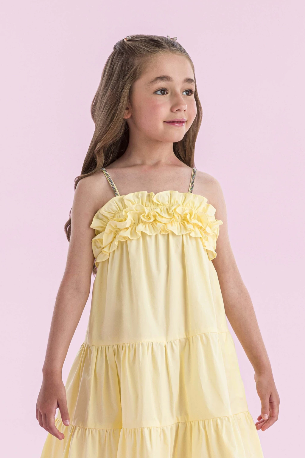 Um toque de sol no guarda-roupa das pequenas! Esse vestido Petit Cherie é a definição de charme e leveza. Em tom amarelo pastel, ele possui modelagem ampla e confortável, com recortes em camadas que criam movimento e delicadeza. O destaque fica por conta dos babados no busto, que trazem um efeito volumoso encantador, e das alcinhas finas com brilho sutil que completam o visual com sofisticação. Perfeito para ocasiões especiais em dias ensolarados, ensaios fotográficos ou momentos em família.